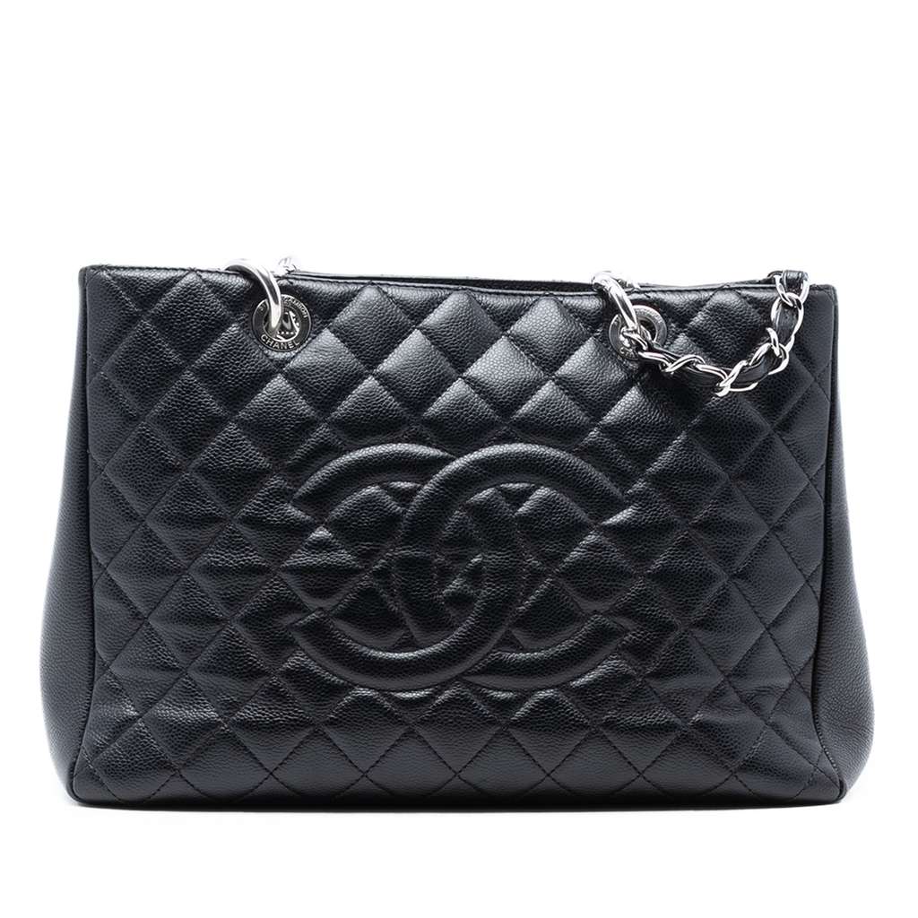The Grand Shopping Tote features a quilted Caviar leather body, leather woven chain shoulder straps, an open top, an interior zip compartment, an exterior back slip pocket, and interior zip and slip pockets.