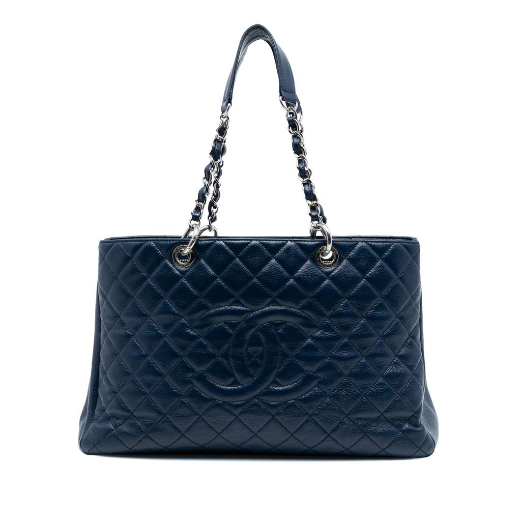The Grand Shopping Tote features a caviar leather body, a curb chain straps, an open top, a back exterior slip pocket, and interior zip and slip pockets.