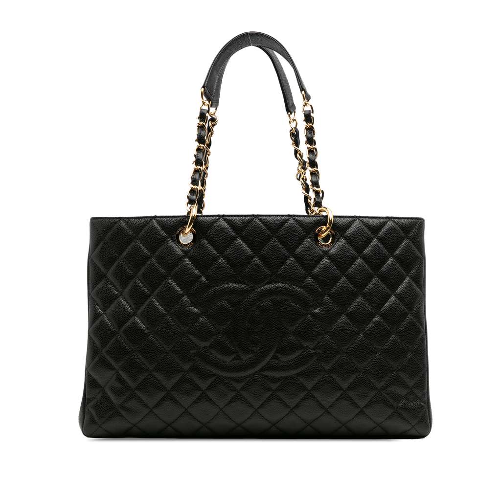 The Grand Shopping Tote features a caviar leather body, a back exterior slip pocket, a curb chain straps, an open top, and interior zip and slip pockets.