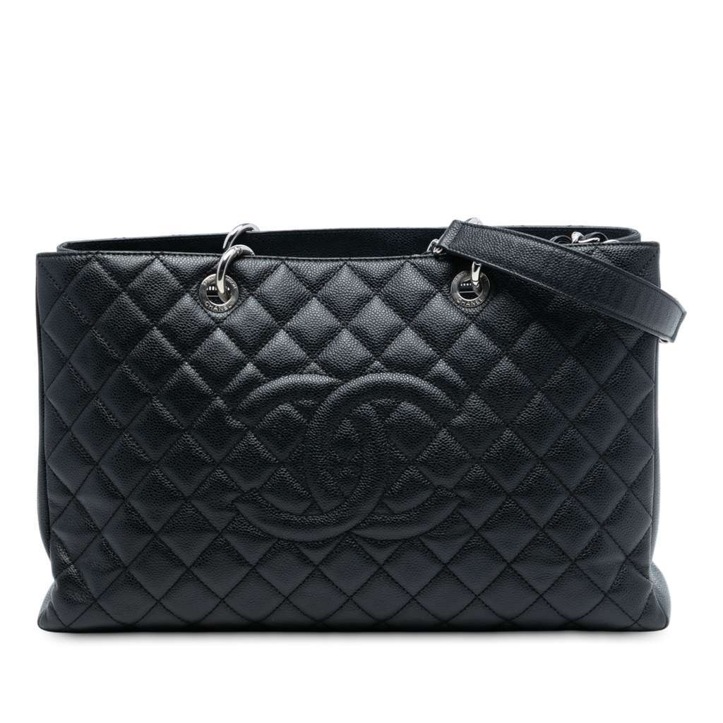 The Grand Shopping Tote features a caviar leather body, a back exterior slip pocket, a curb chain straps, an open top, and interior zip and slip pockets.