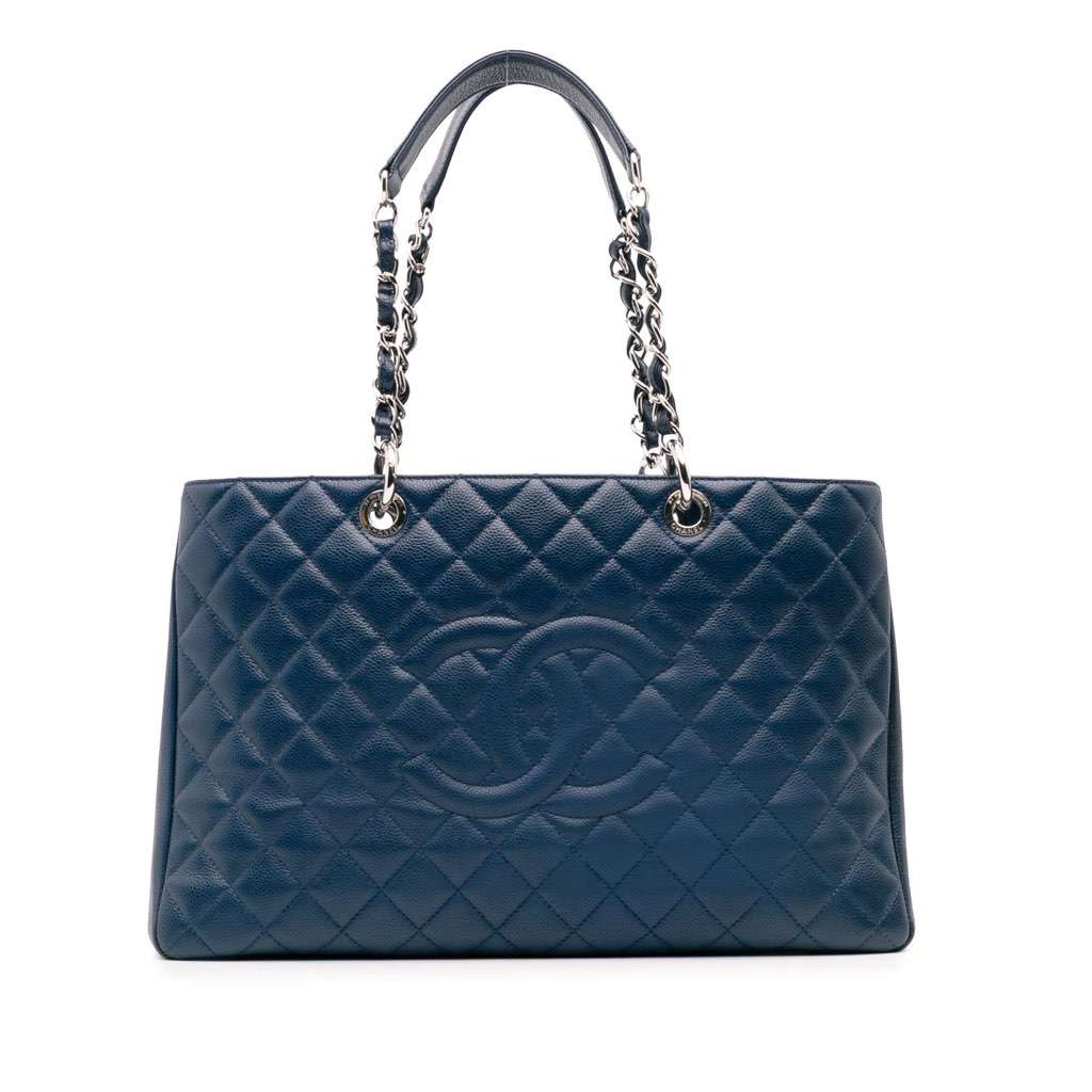 The Grand Shopping Tote features a caviar leather body, a curb chain straps, an open top, a back exterior slip pocket, and interior zip and slip pockets.