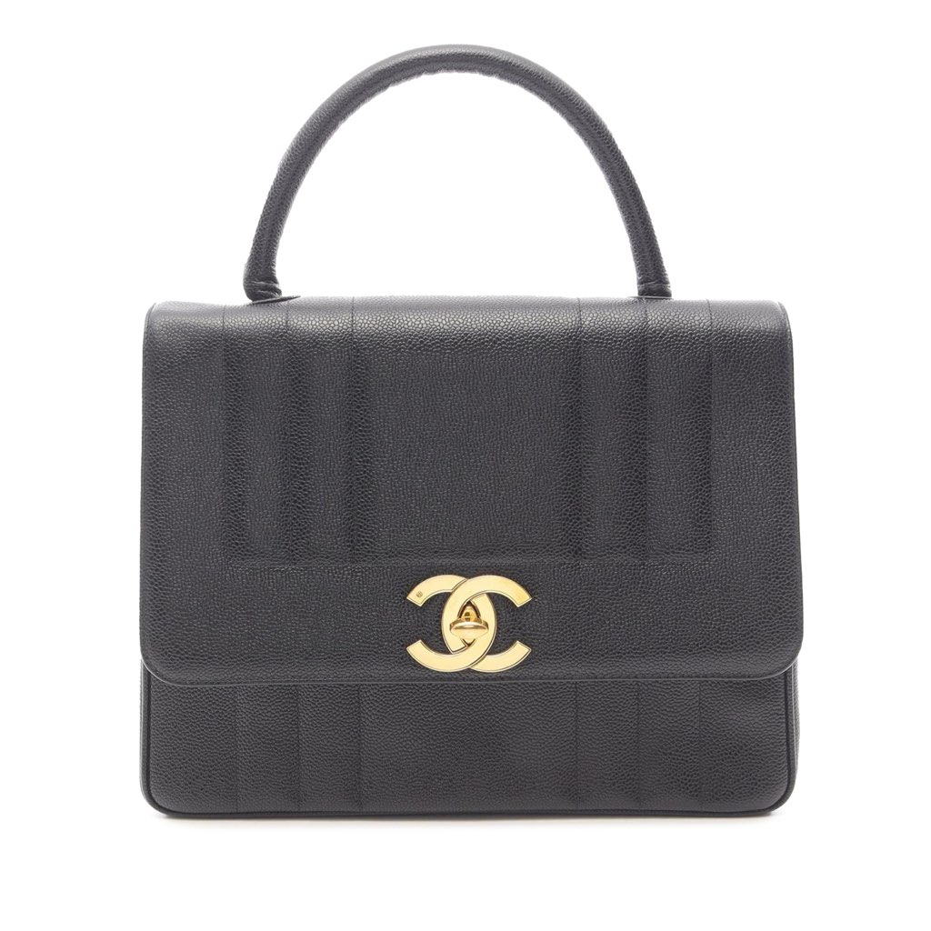The Mademoiselle Kelly features a caviar leather body, a rolled top handle, a top flap with CC turn lock closure, an exterior slip pocket, and interior zip and slip pockets.