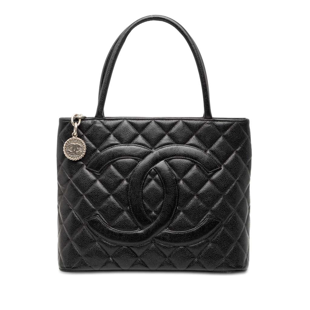The Medallion tote bag features a quilted caviar leather body, rolled leather handles, a top zip closure, an exterior back slip pocket, and interior zip and slip pockets.