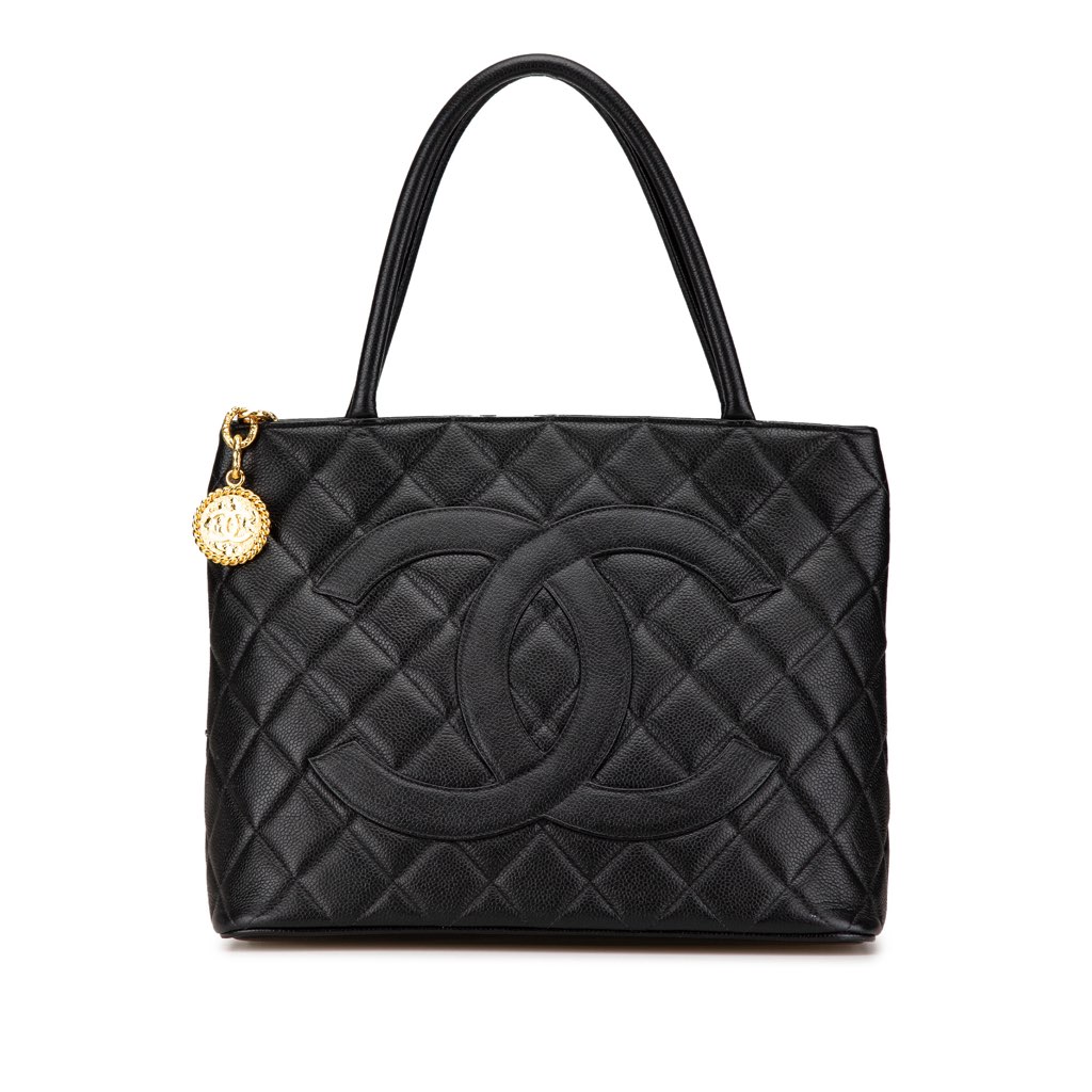 The Medallion tote bag features a quilted caviar leather body, rolled leather handles, a top zip closure, an exterior back slip pocket, and interior zip and slip pockets.