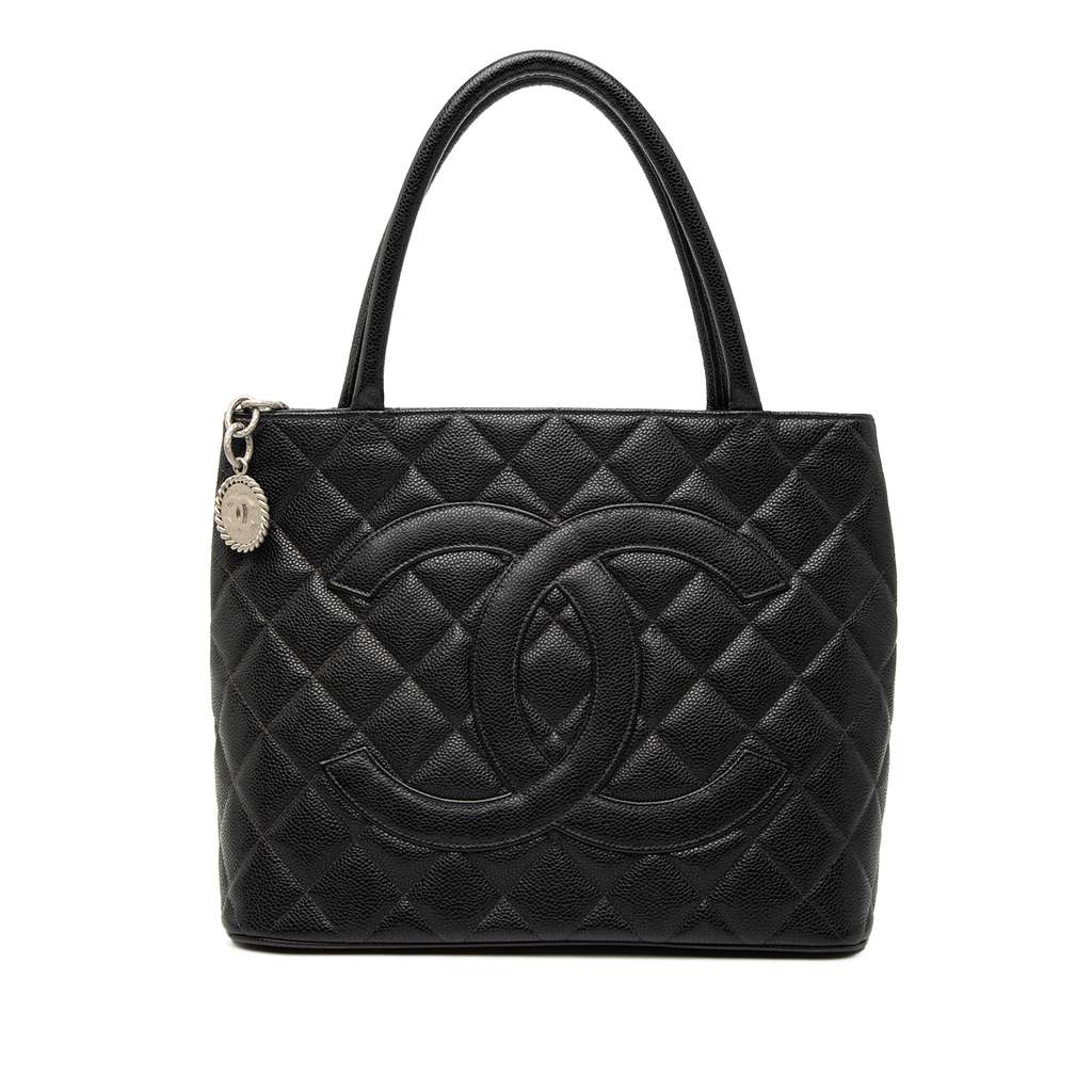 The Medallion tote bag features a quilted caviar leather body, rolled leather handles, a top zip closure, an exterior back slip pocket, and interior zip and slip pockets.