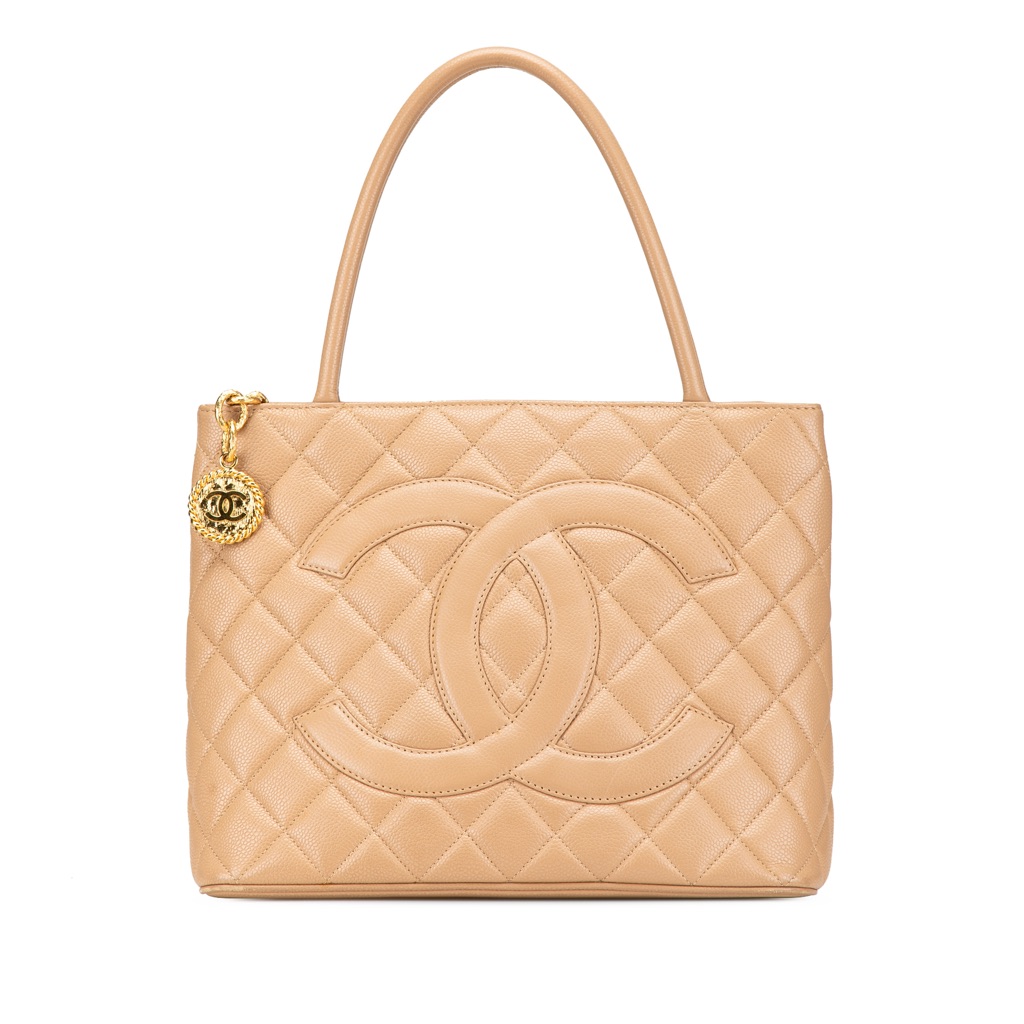 The Medallion tote bag features a quilted caviar leather body, rolled leather handles, a top zip closure, an exterior back slip pocket, and interior zip and slip pockets.