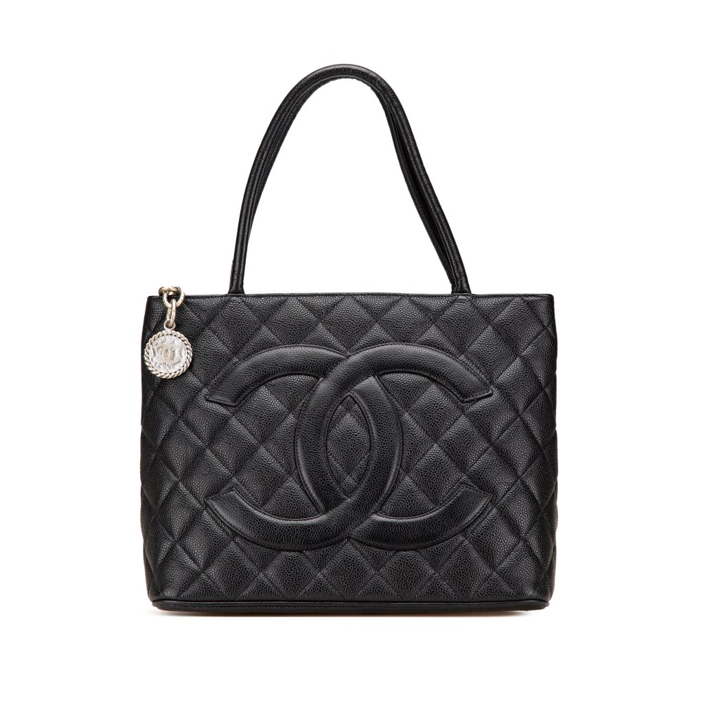 The Medallion tote bag features a quilted caviar leather body, rolled leather handles, a top zip closure, an exterior back slip pocket, and interior zip and slip pockets.