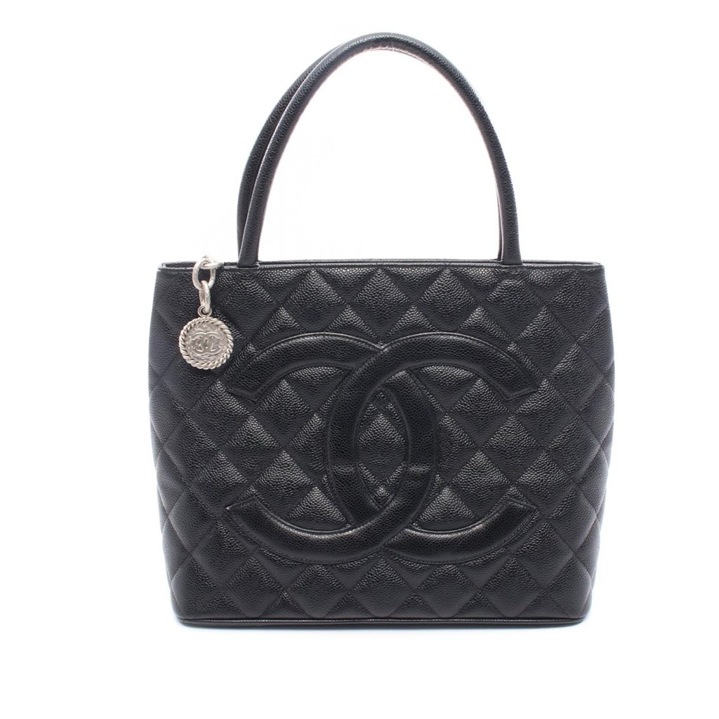 The Medallion tote bag features a quilted caviar leather body, rolled leather handles, a top zip closure, an exterior back slip pocket, and interior zip and slip pockets.