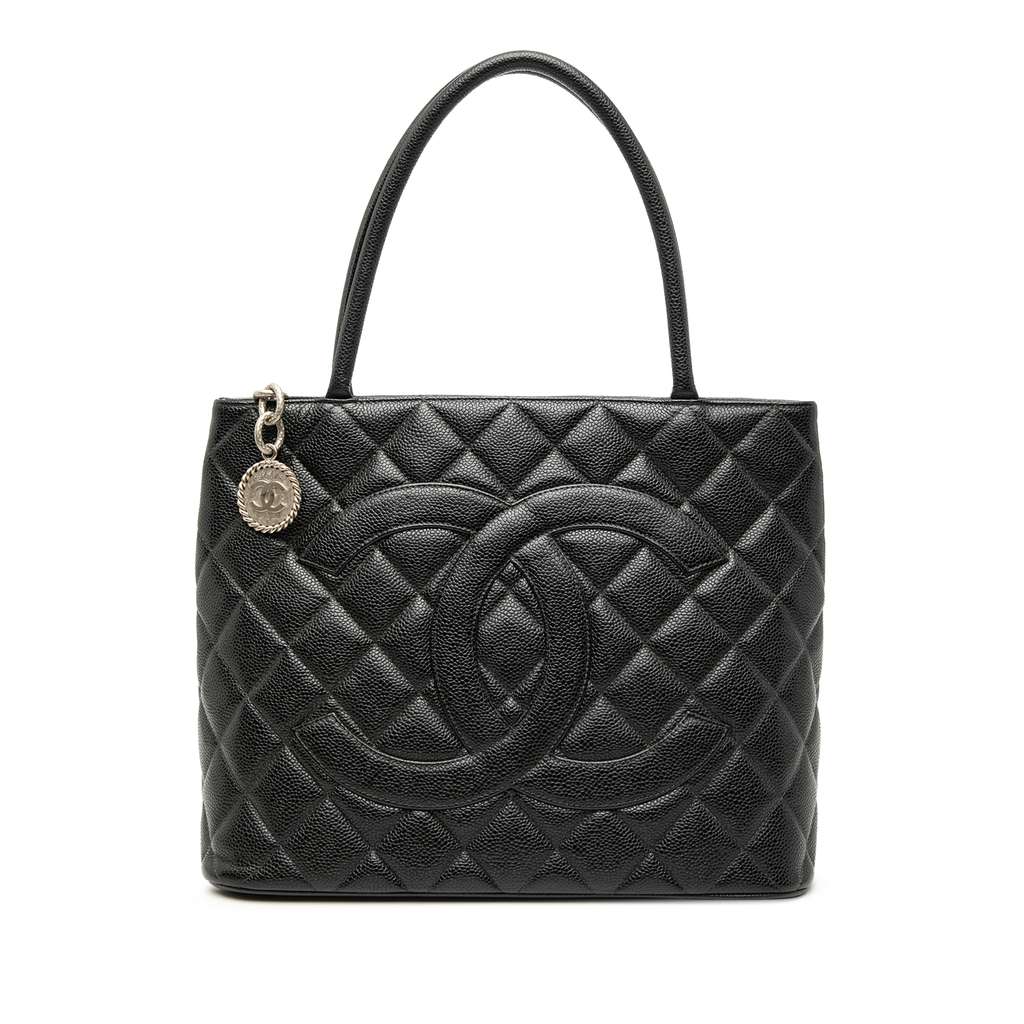 The Medallion tote bag features a quilted caviar leather body, rolled leather handles, a top zip closure, an exterior back slip pocket, and interior zip and slip pockets.