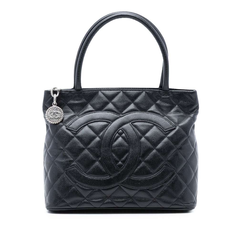 The Medallion tote bag features a quilted caviar leather body, rolled leather handles, a top zip closure, an exterior back slip pocket, and interior zip and slip pockets.
