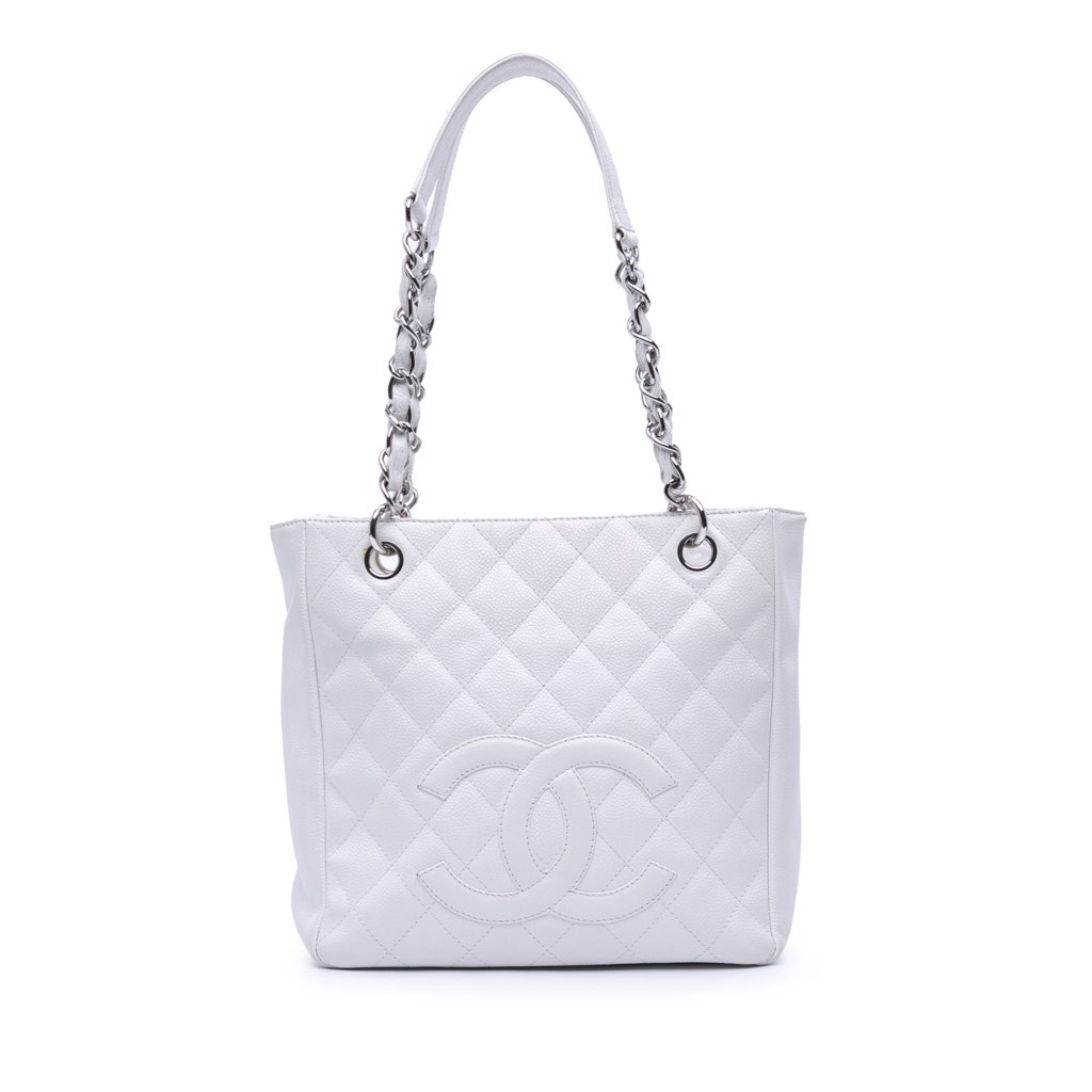 This tote features a quilted caviar leather body, leather woven chain link shoulder straps with leather guard, an open top with magnetic snap closure, an exterior back slip pocket, and interior zip and slip pockets.