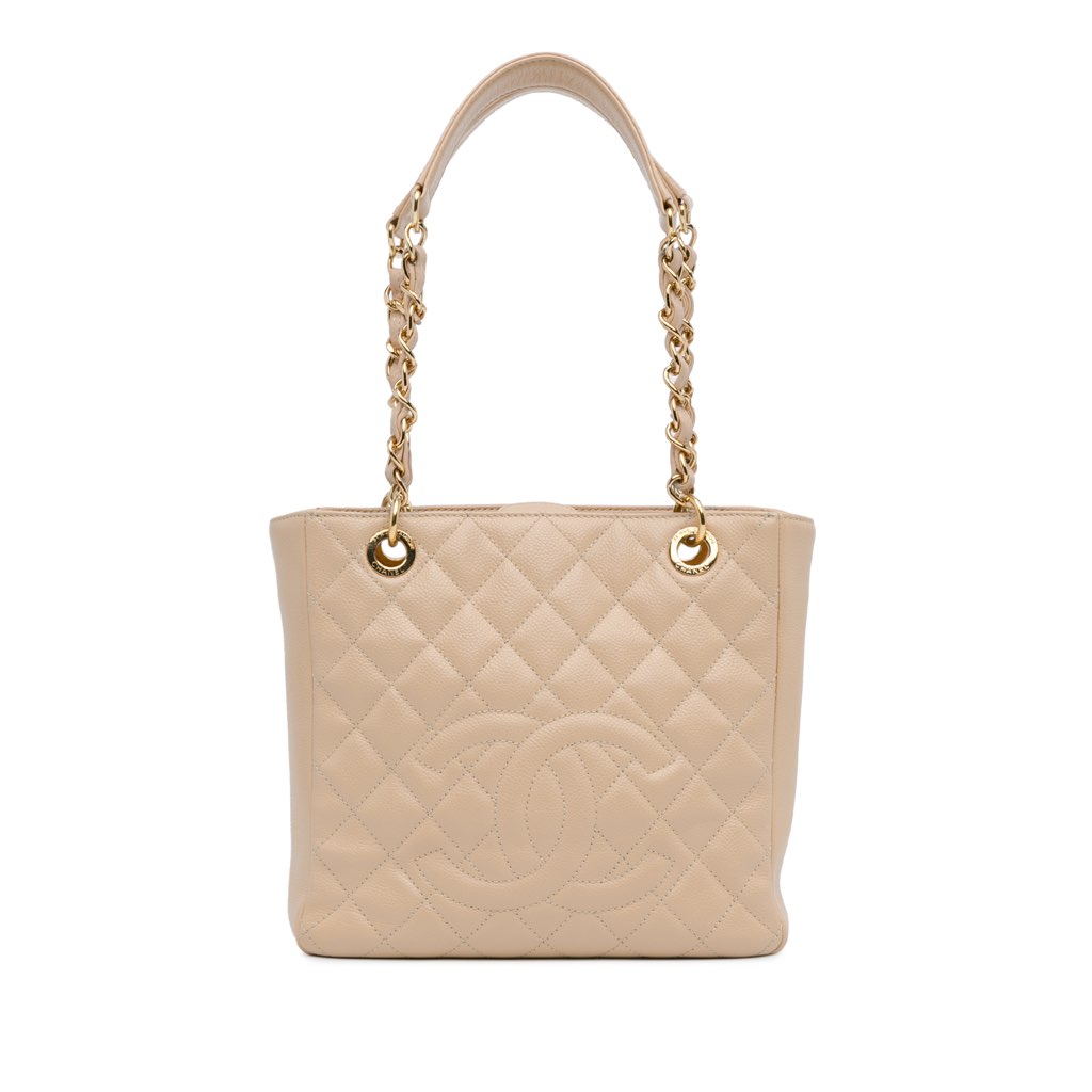 This tote features a quilted caviar leather body, leather woven chain shoulder straps with leather guard, an open top with magnetic snap closure, an exterior slip pocket, and interior zip and slip pockets.