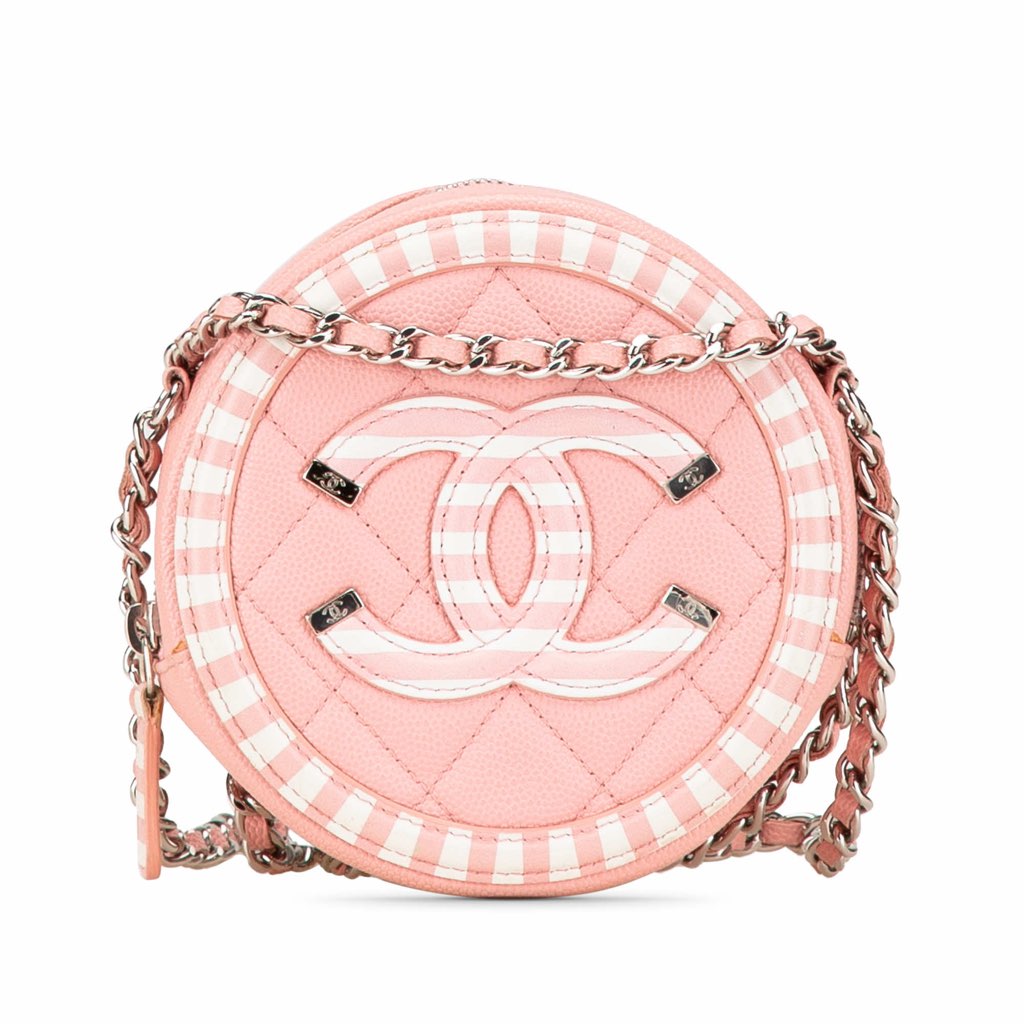 The CC Filigree features a quilted caviar leather body, a leather woven chain link strap, a top zip closure, and interior slip pockets.