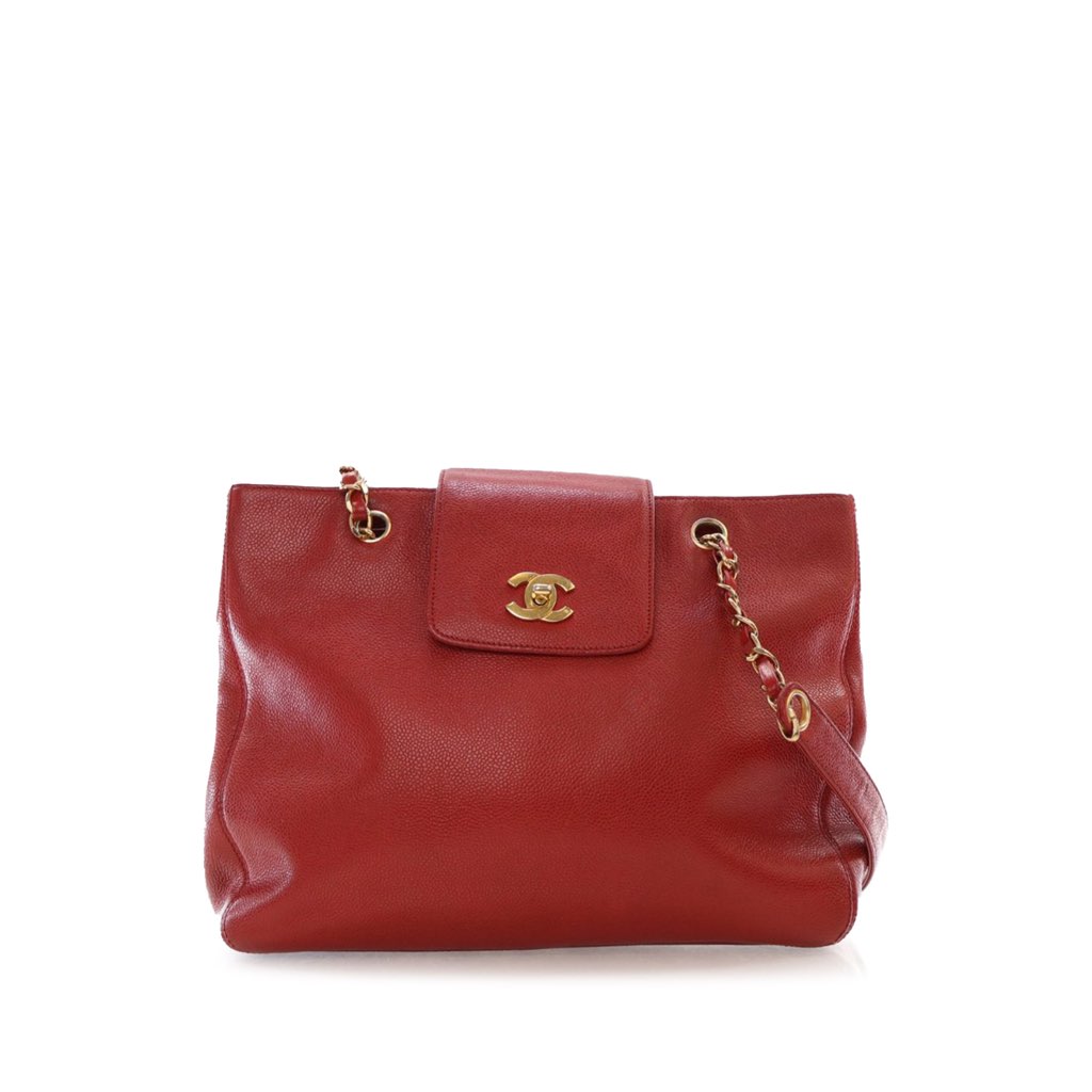 The Supermodel shoulder bag features a caviar leather body, chain and leather straps, a top strap with CC turn lock closure, an exterior back slip pocket, and interior zip pockets.