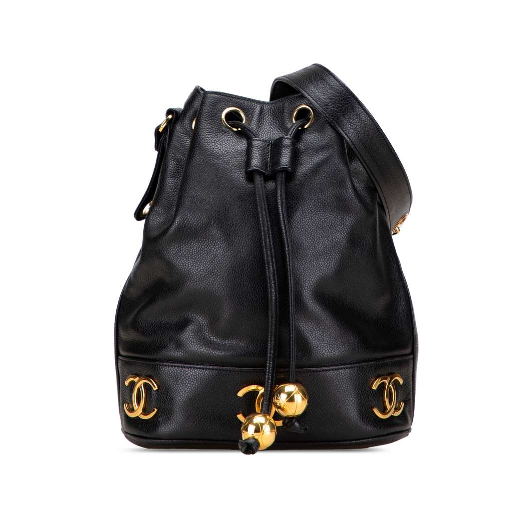 This bucket bag features a caviar leather body, a gold-tone leather woven chain link shoulder strap with leather guard, and an open top with a drawstring closure and pouch inclusion.