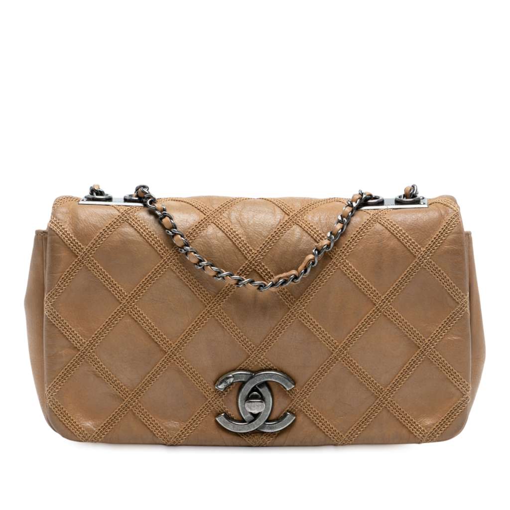 This flap bag features a leather body, leather woven chain straps, a front flap with a CC turnlock closure, and an interior zip pocket.