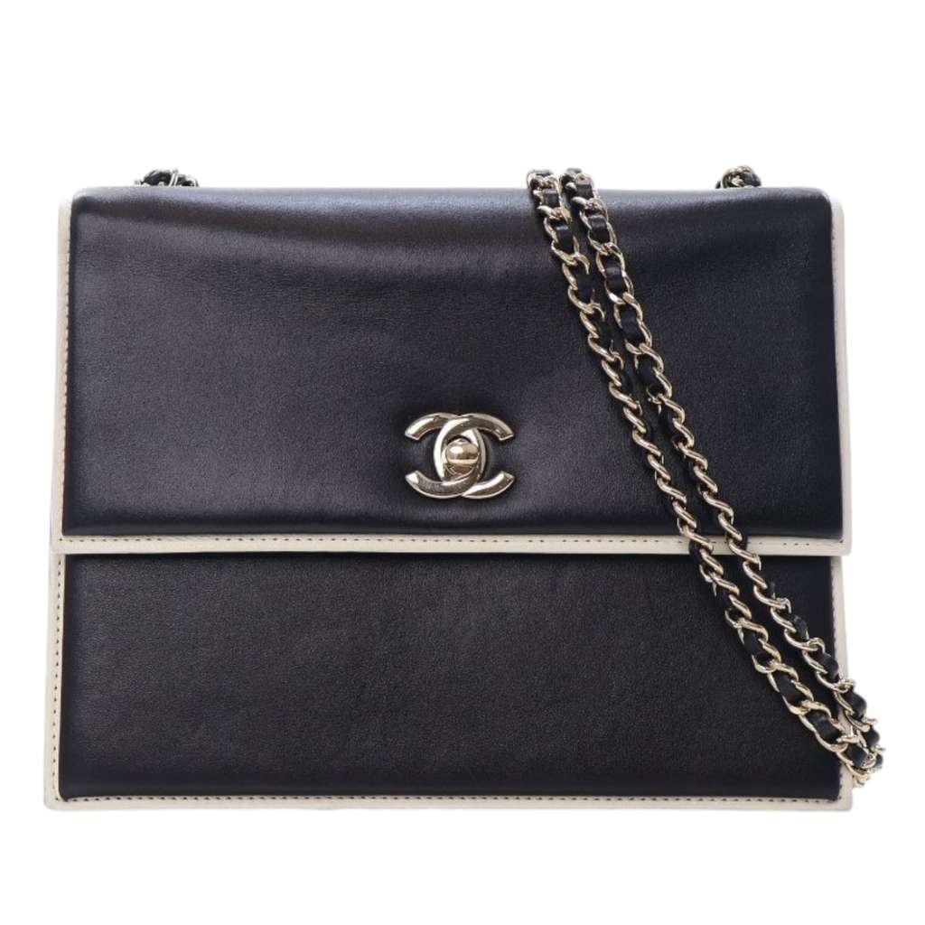 This crossbody bag features a leather body, a leather-woven chain strap, a front flap with CC turn lock closure, and an interior slip pocket.