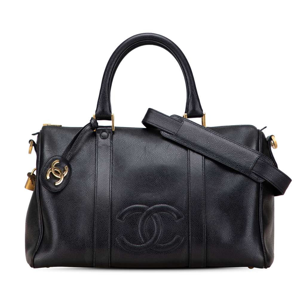 This boston bag features a caviar leather body, rolled leather handles, a detachable flat leather strap, an open top, and an interior zip pocket.