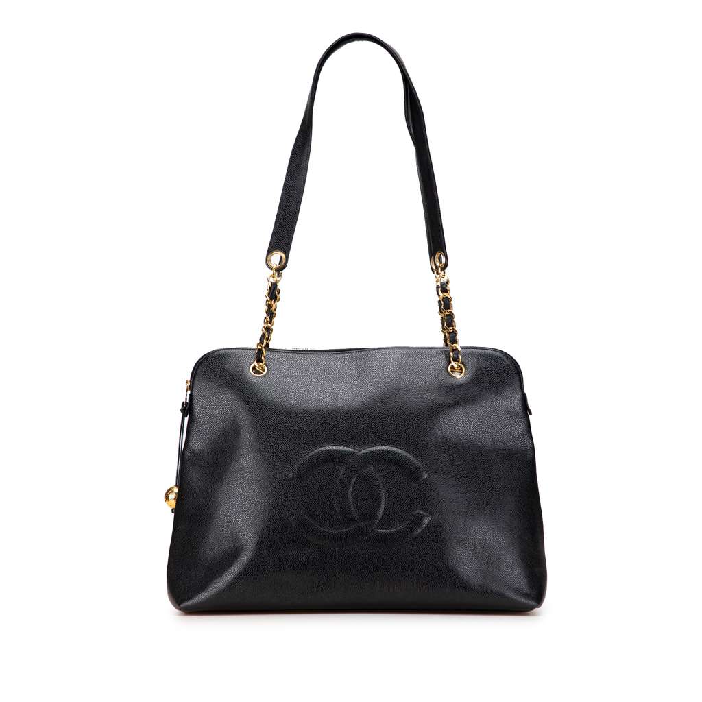 This tote bag features a caviar leather body, leather woven chain and flat leather straps, a top zip closure, and interior zip pockets.