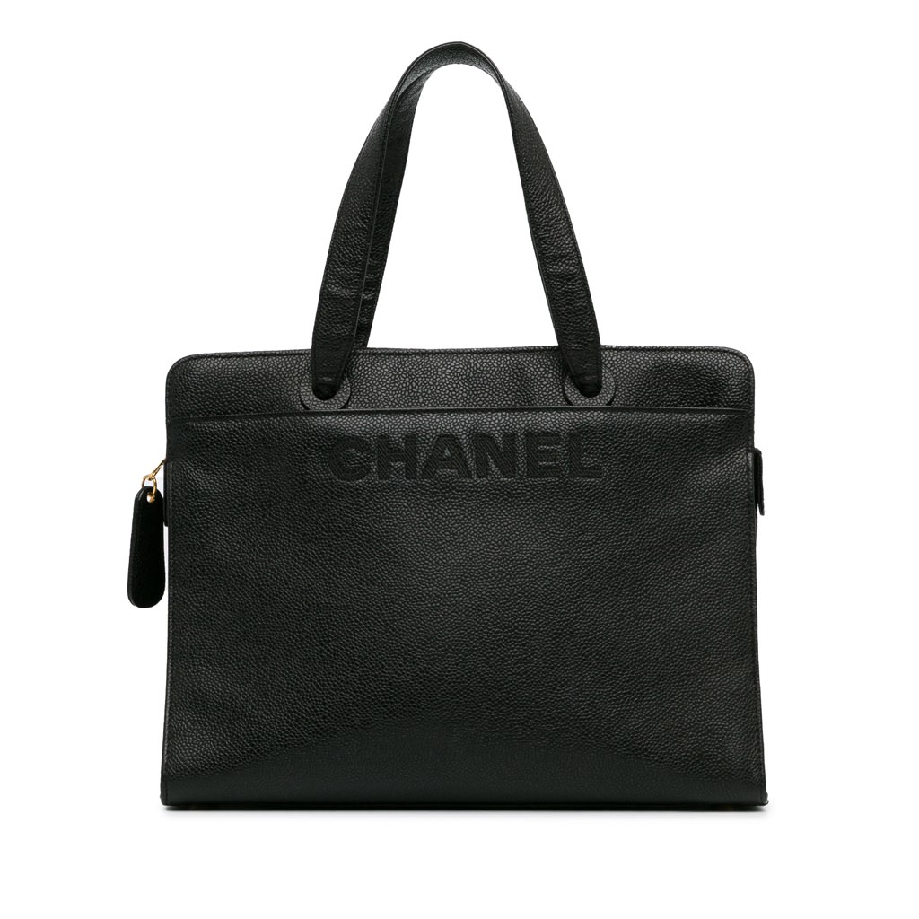 This tote bag features a caviar leather body, flat leather handles, a top zip closure, exterior slip pockets, and interior zip pockets.