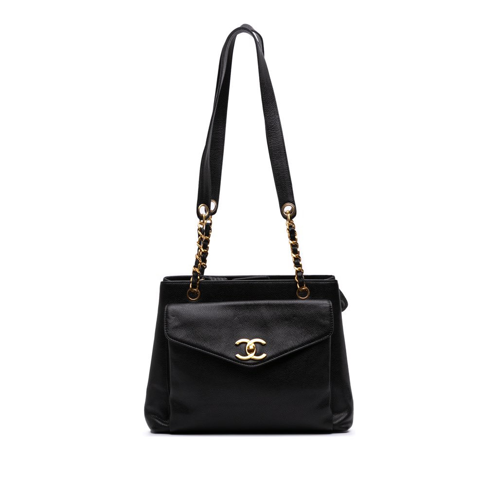 This shoulder bag features a caviar leather body, leather woven chains link strap with leather guard, an open top, an interior center zip compartment, and an exterior front flap compartment with CC turn-lock closure.