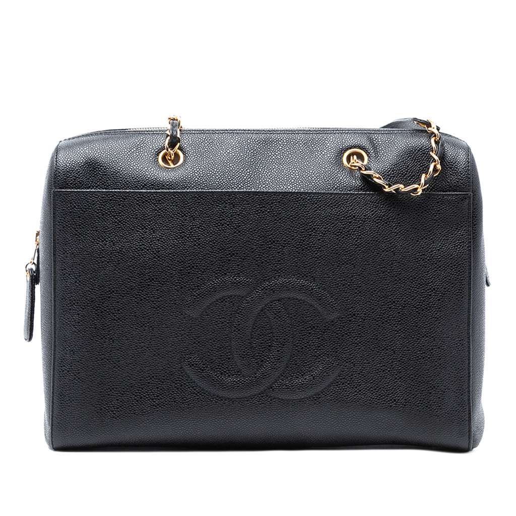 This shoulder bag features a caviar leather body, curb chain straps, a top zip closure, an exterior front slip pocket, an exterior back zip pocket, and interior zip pockets.