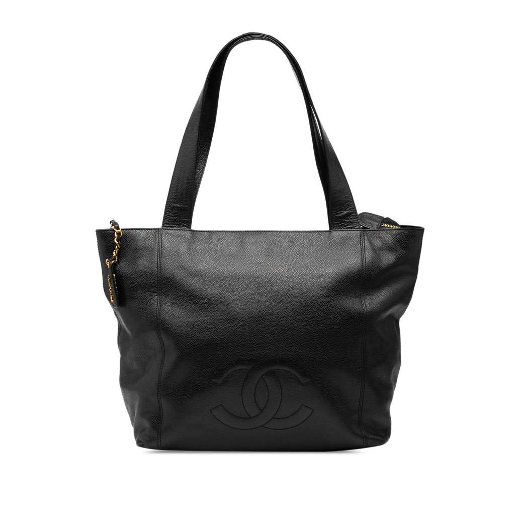 This tote bag features a caviar leather body, flat leather straps, a top zip closure, and an interior zip pocket.