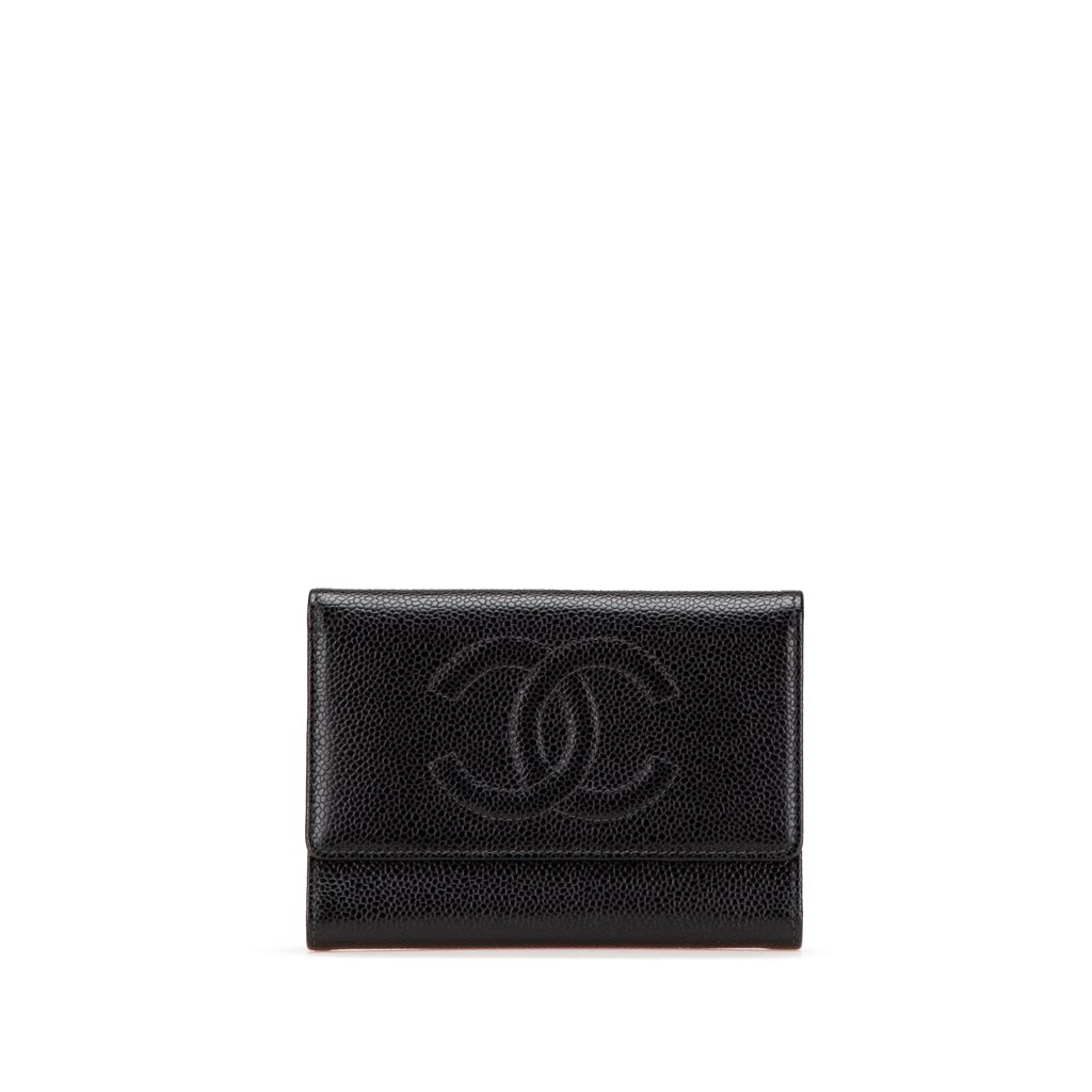 This wallet features a caviar leather body, a top flap with snap button closure, an exterior back zip pocket, interior slip compartments, and interior card slots.