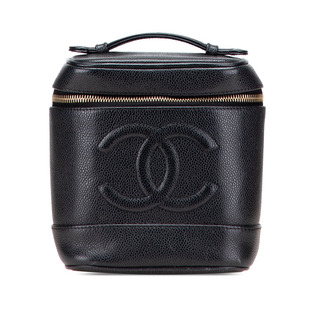 This vanity bag features a caviar leather body, a flat leather top handle, a zip around closure, and an interior slip pocket.