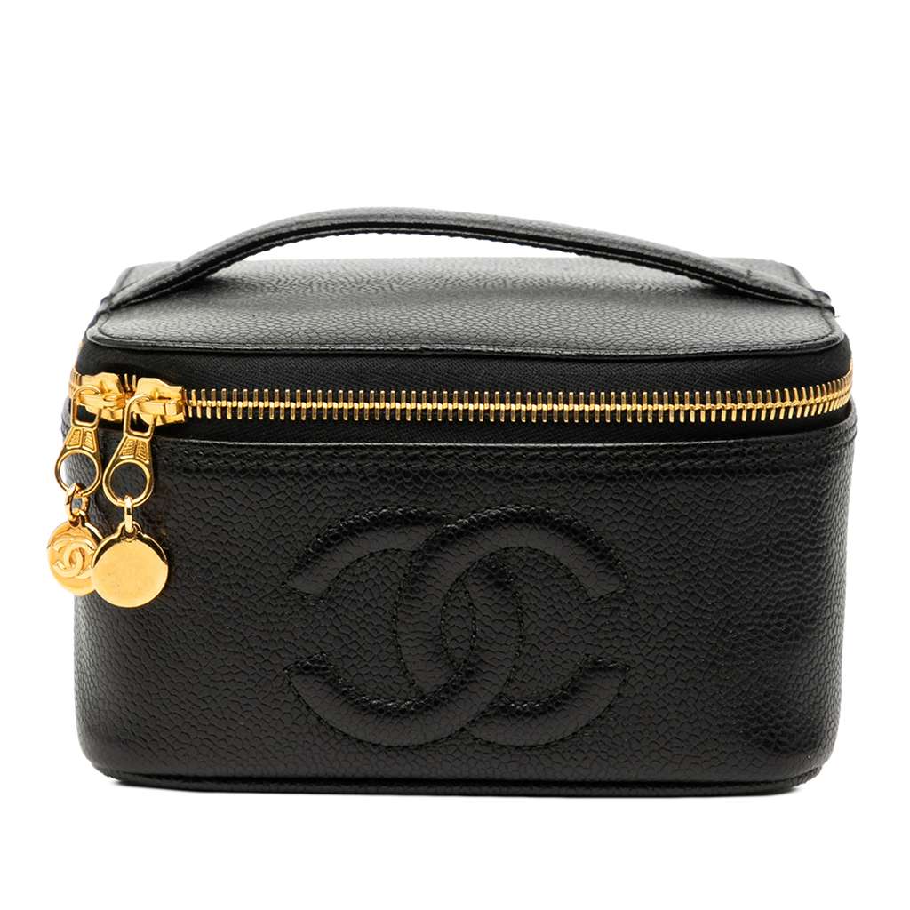 This vanity bag features a caviar leather body, a flat top handle, a zip around closure, and an interior slip pocket.