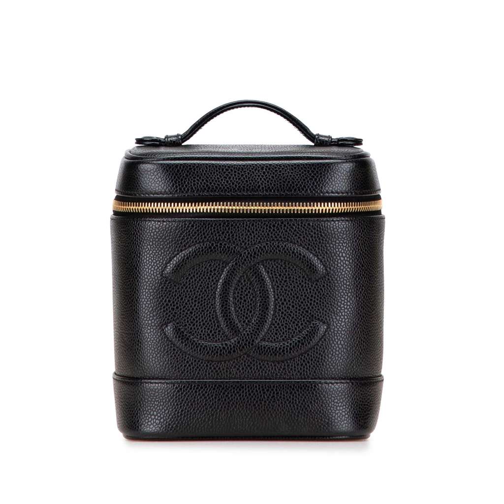 This vanity bag features a caviar leather body, a flat leather top handle, a zip around closure, and an interior slip pocket.