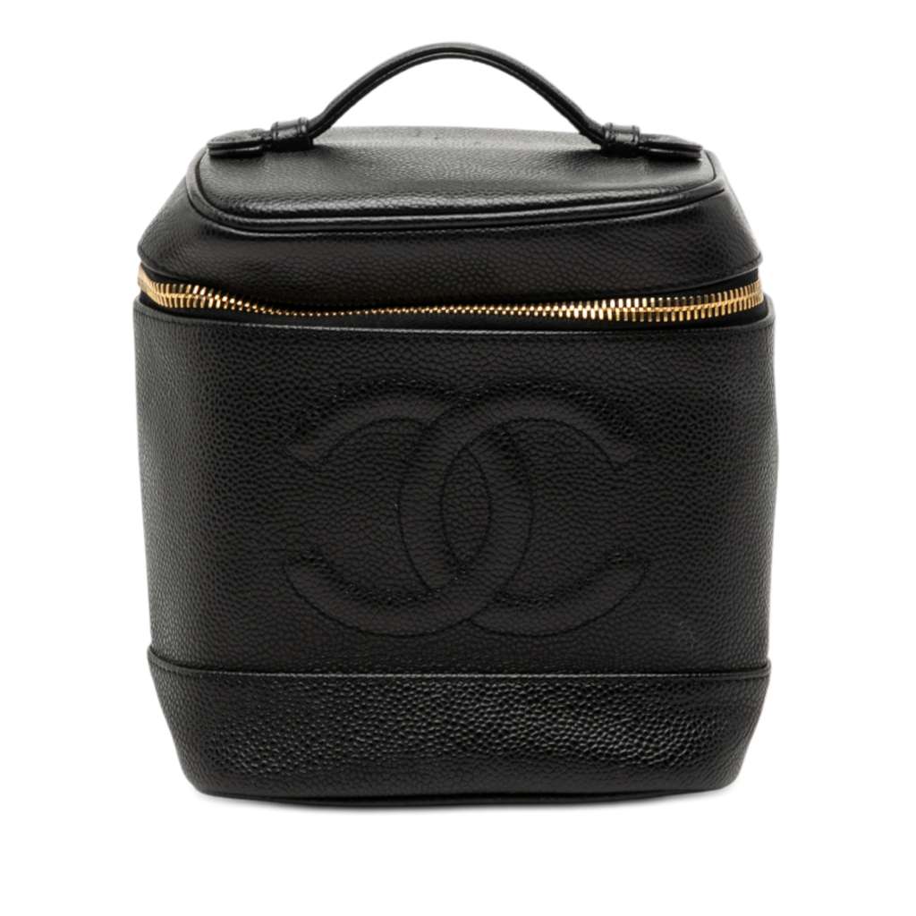 This vanity bag features a caviar leather body, a flat leather top handle, a zip around closure, and an interior slip pocket.