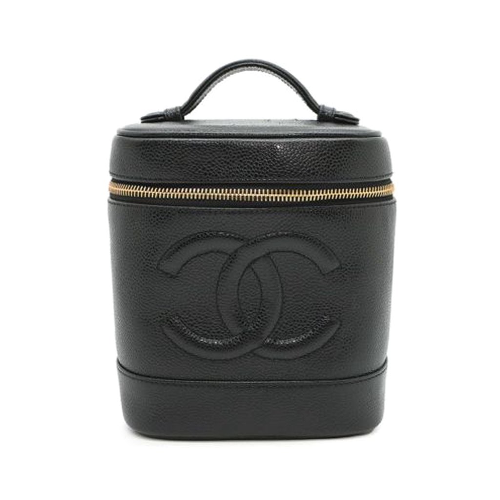 This vanity bag features a caviar leather body, a flat leather top handle, a zip around closure, and an interior slip pocket.