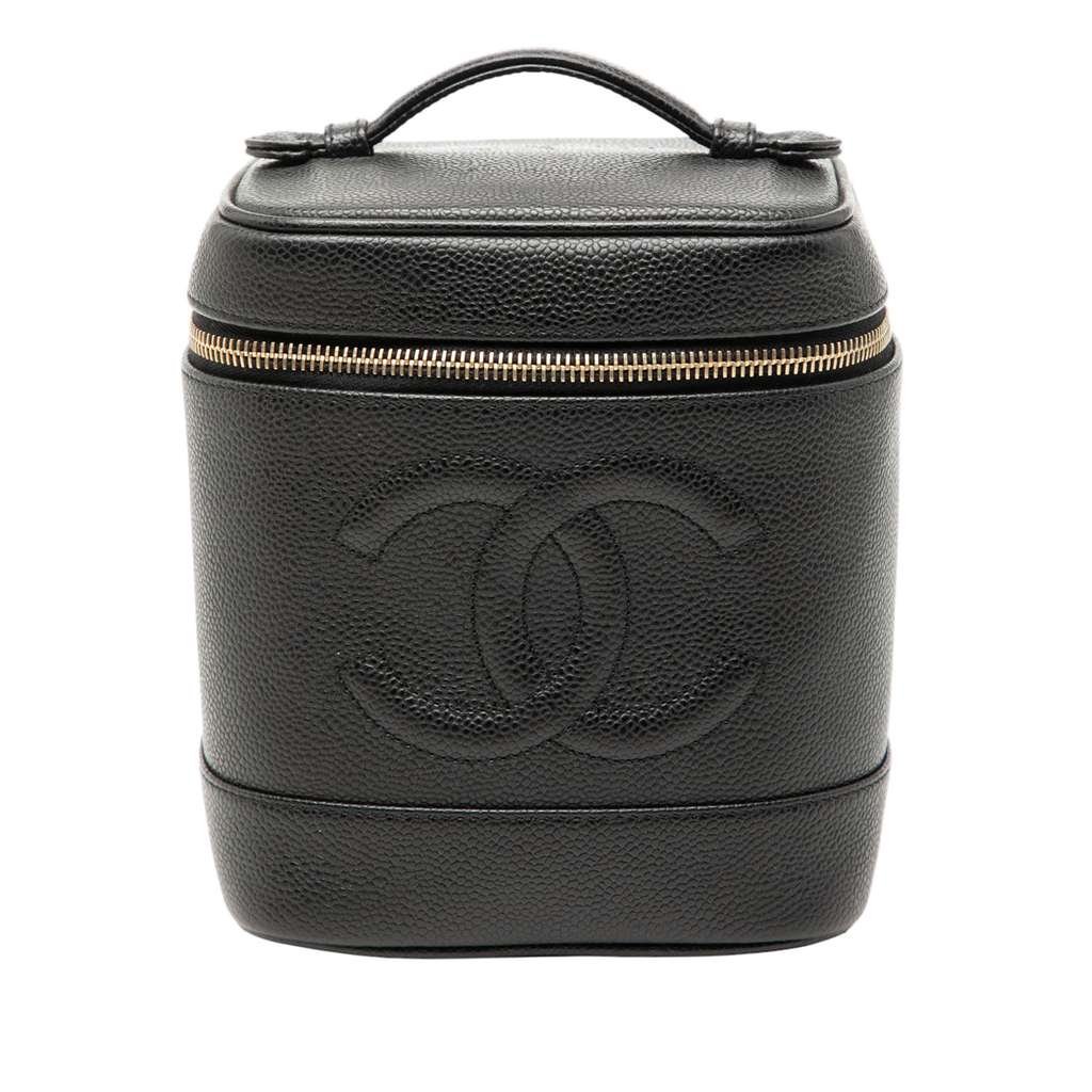 This vanity bag features a caviar leather body, a flat leather top handle, a zip around closure, and an interior slip pocket.