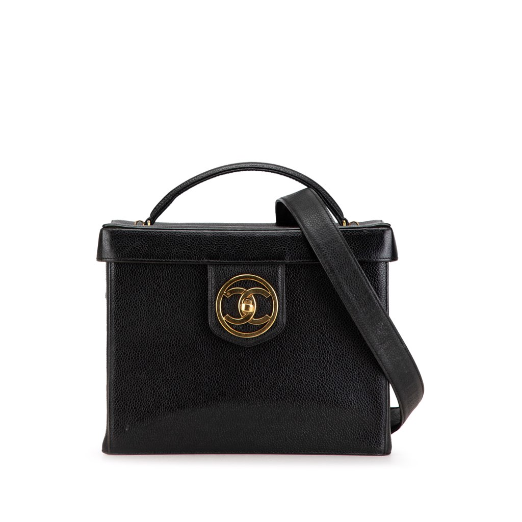 This vanity bag features a caviar leather body, a flat leather top handle, a detachable shoulder strap, a top closure with interlocking Cs and twist lock closure, an interior mirror, and interior zip and slip pockets.