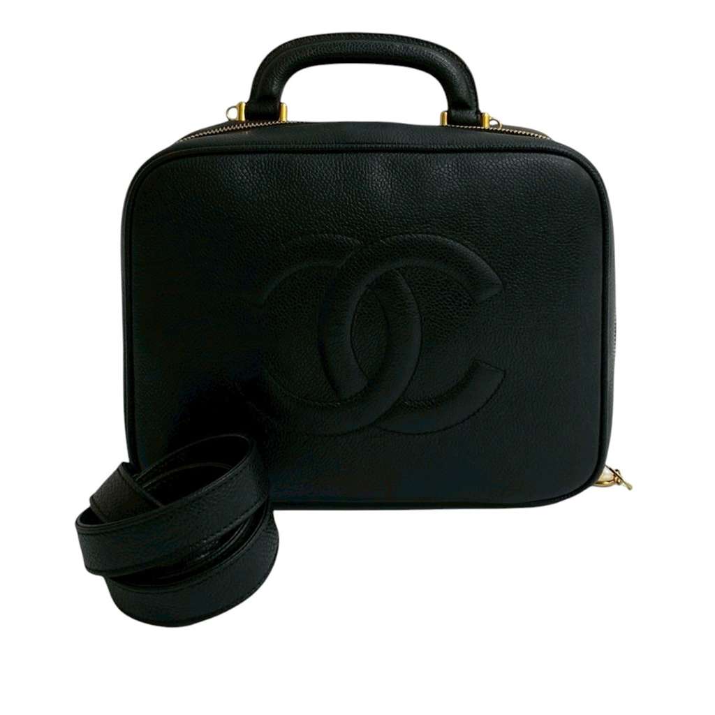 This vanity bag features a caviar leather body, a flat top handle, a detachable flat leather strap, and a zip around closure.