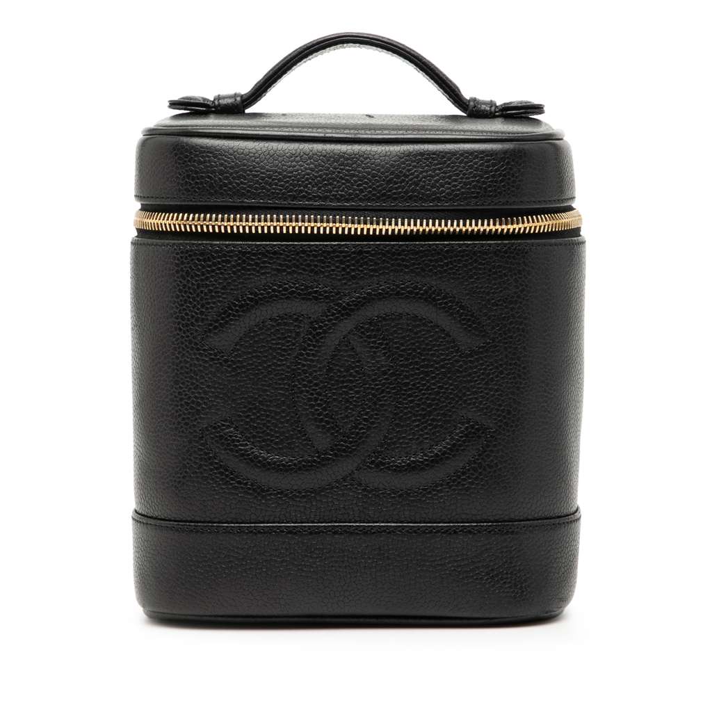 This vanity bag features a caviar leather body, a flat leather top handle, a zip-around closure, and an interior slip pocket.
