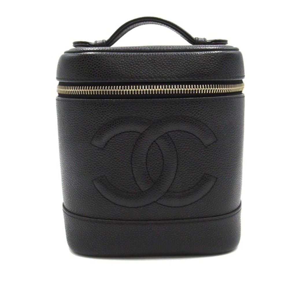 This vanity bag features a caviar leather body, a flat leather top handle, a zip-around closure, and an interior slip pocket.