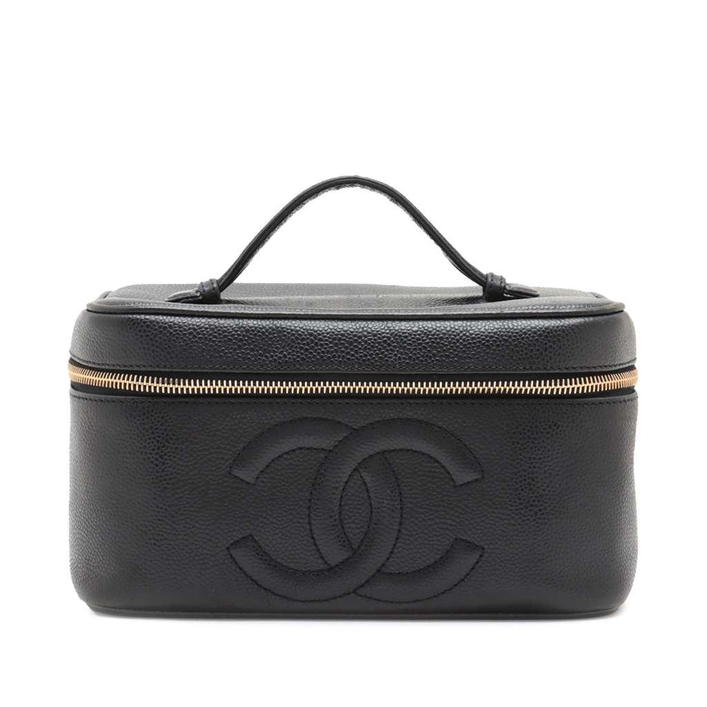 This vanity bag features a caviar leather body, a flat top handle, a zip around closure, and an interior slip pocket.
