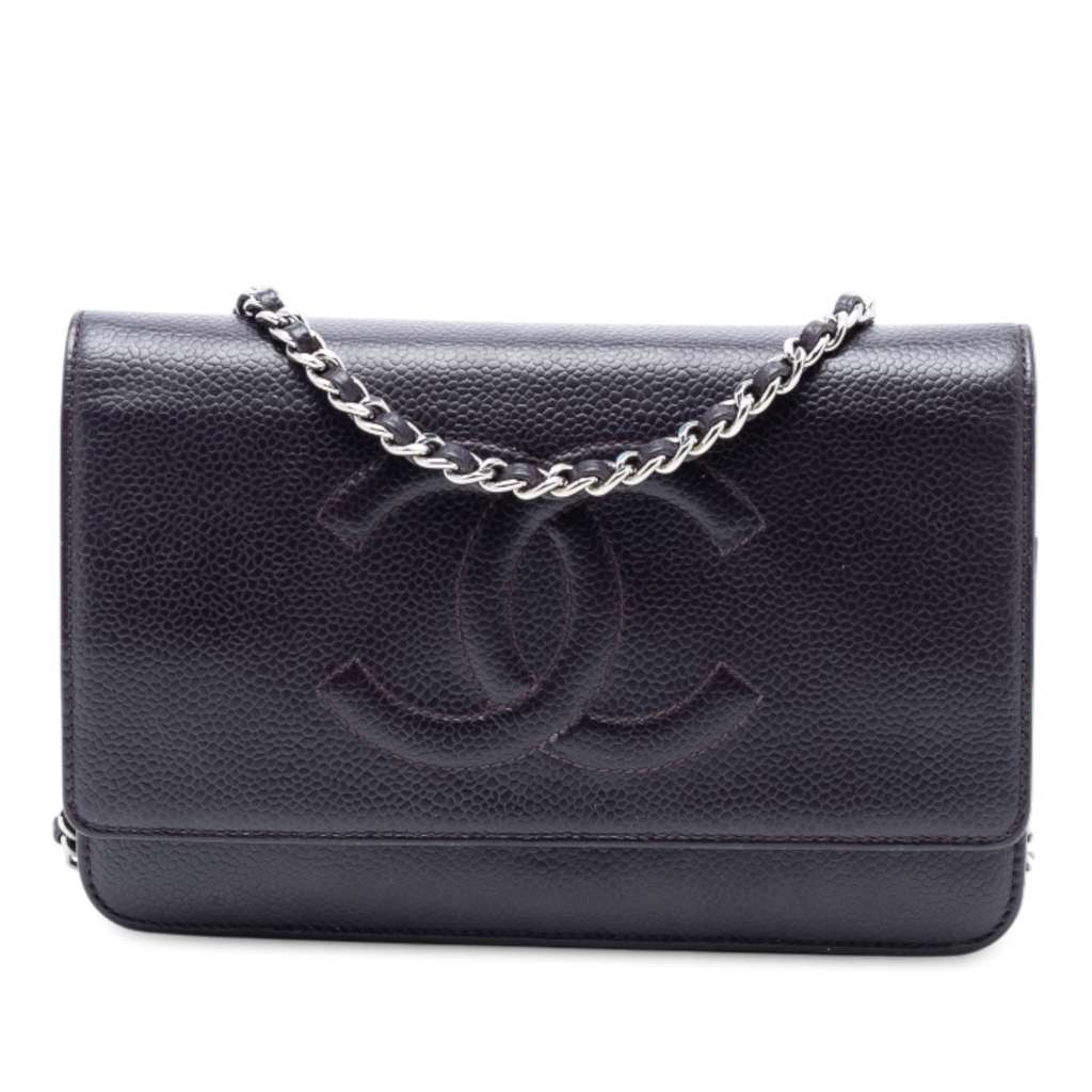 This wallet on chain features a caviar leather body, a leather woven chain strap, a front flap with snap button closure, and interior zip and slip pockets.