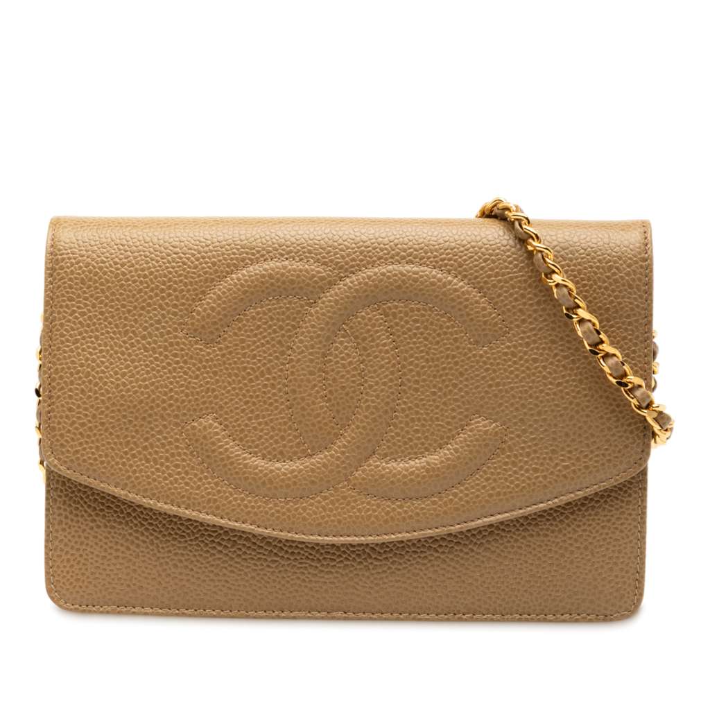 This wallet on chain features a patent caviar leather body, leather woven chain link strap, a front flap with magnetic closure, and interior zip and slip pockets.