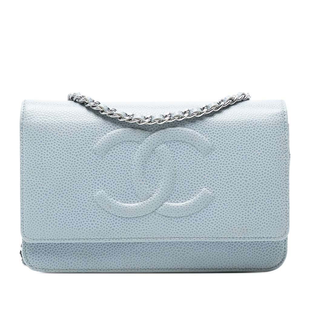 This wallet on chain features a caviar leather body, a leather woven chain link strap, a top flap with a magnetic closure, and interior zip and slip pockets.