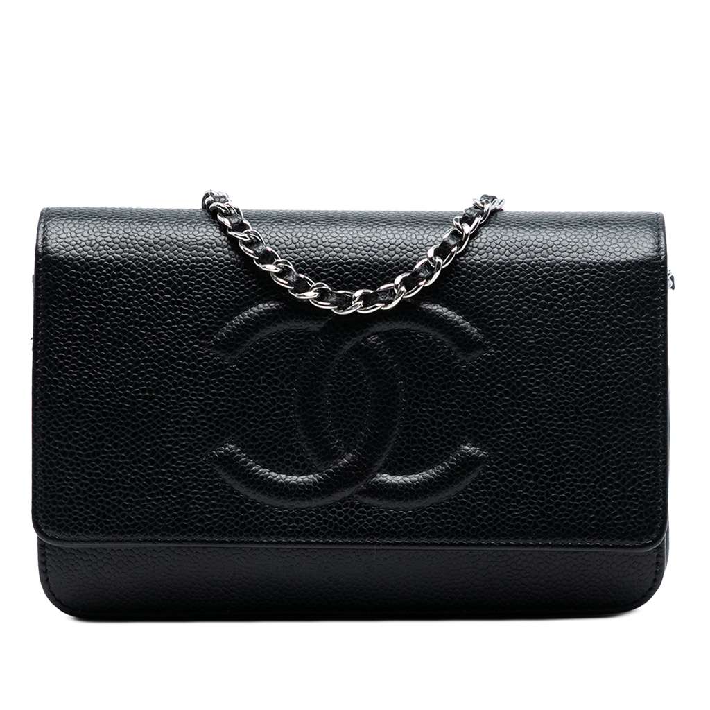 This wallet on chain features a caviar leather body, a leather woven chain link strap, a top flap with a magnetic closure, and interior zip and slip pockets.