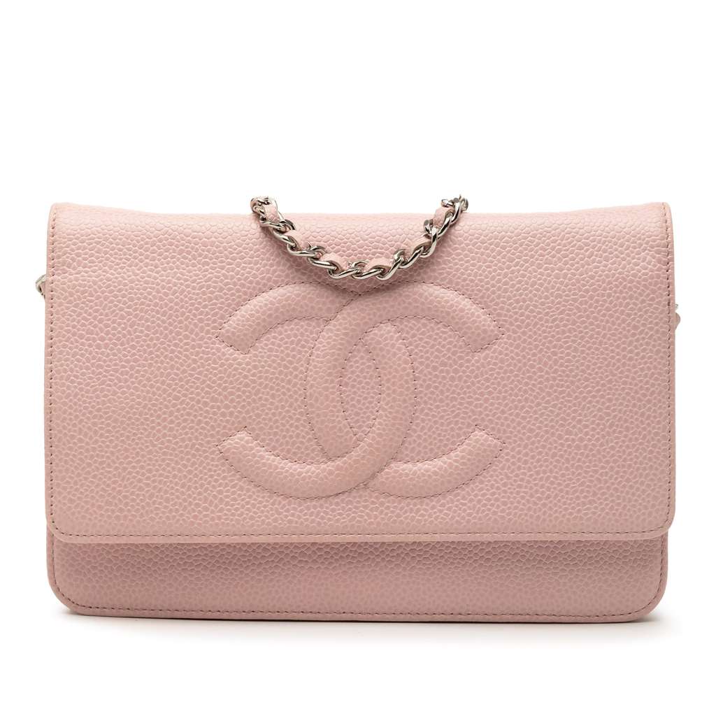 This wallet on chain features a caviar leather body, a detachable chain link strap, a top flap with a magnetic closure, and interior zip and slip pockets.
