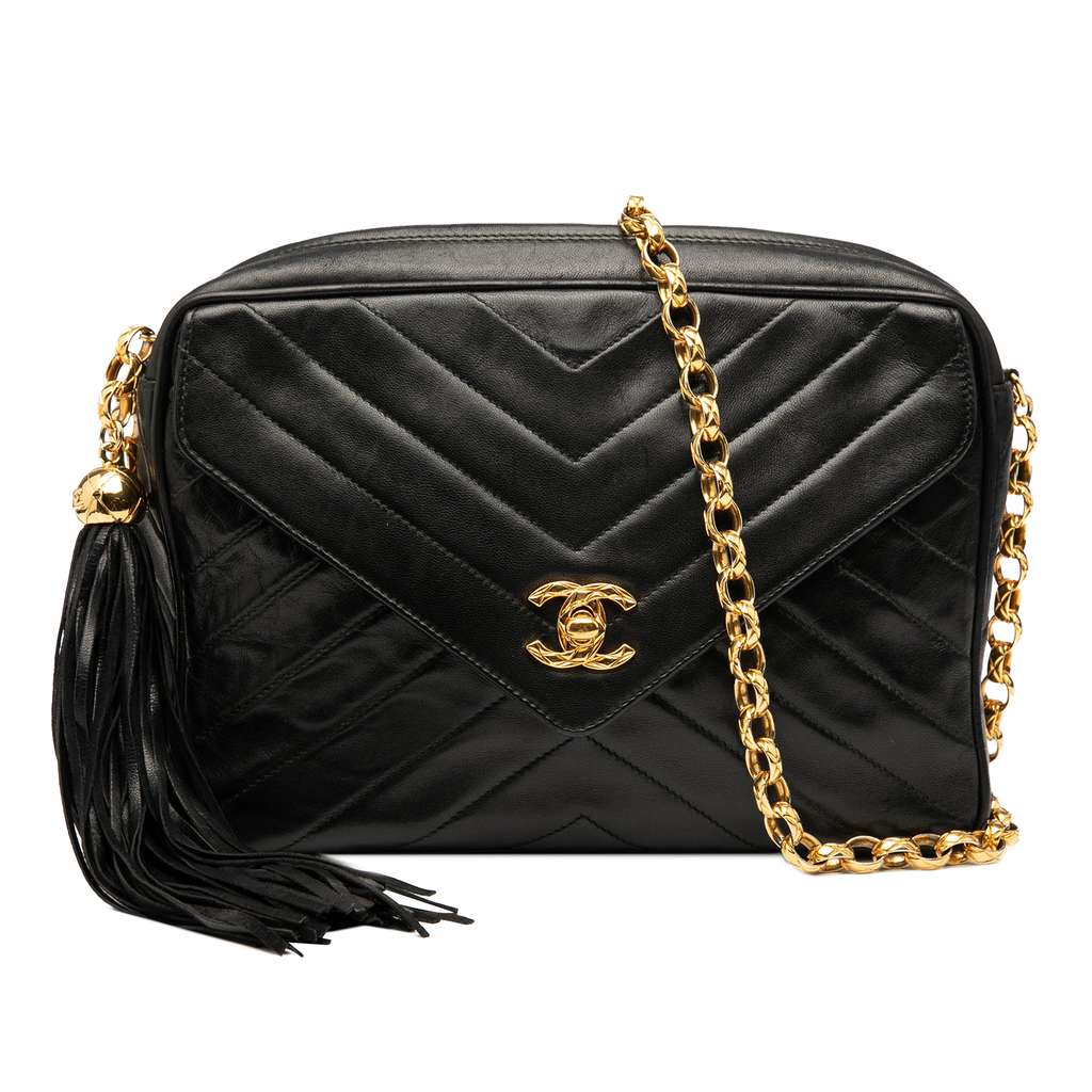This crossbody bag features a quilted lambskin leather body, a chain link shoulder strap, a top zip closure, a front flap with double Cs and a twist lock closure, and interior zip and slip pockets.