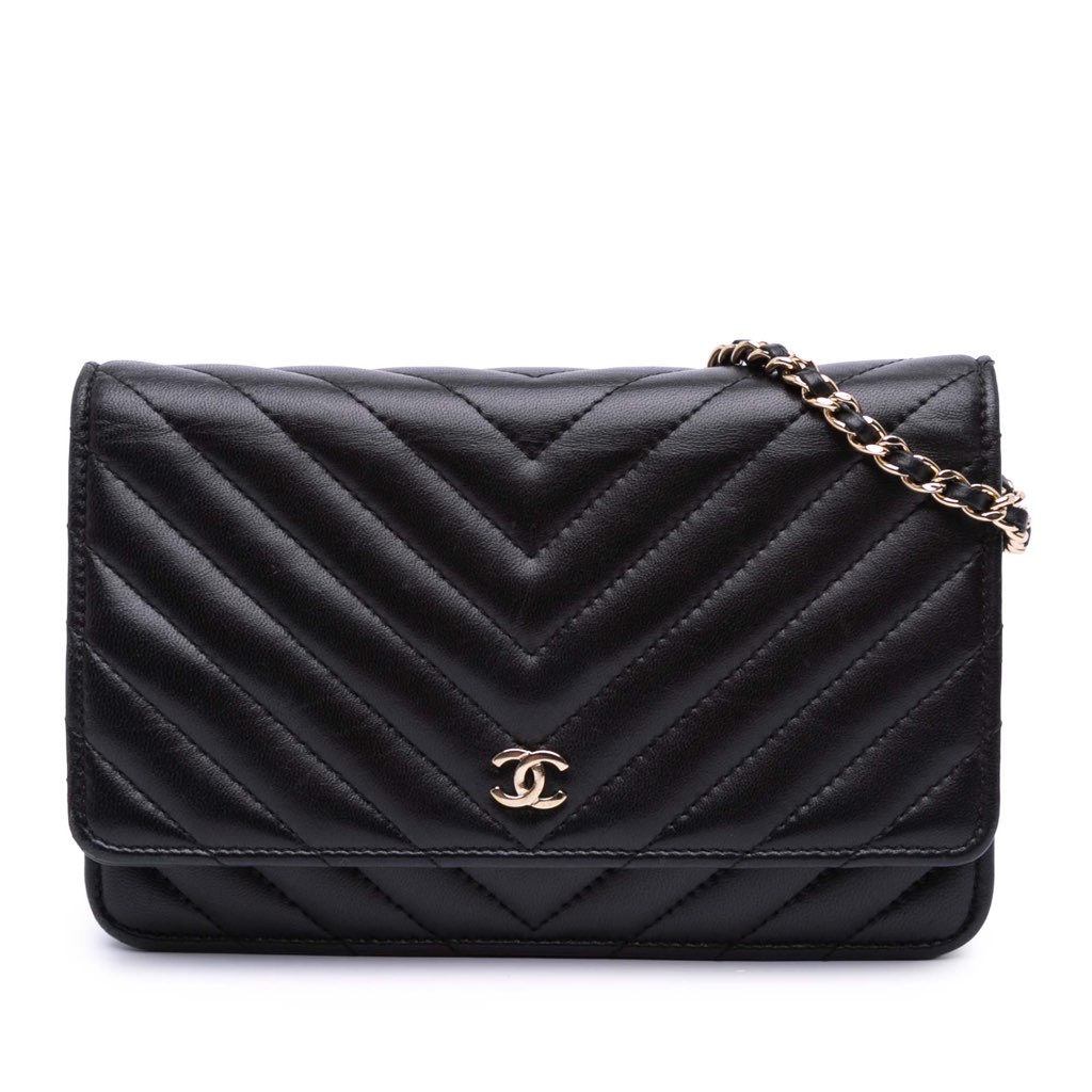 This wallet on chain features a quilted lambskin leather body, a leather-woven chain shoulder strap, a flap with snap button closure, and interior slip and zip pockets.