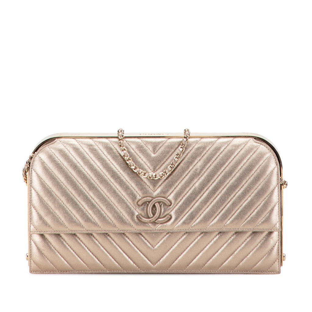 This chain clutch features a lambskin leather body, a chain link strap, a front flap with magnetic snap closure, and an interior slip pocket.