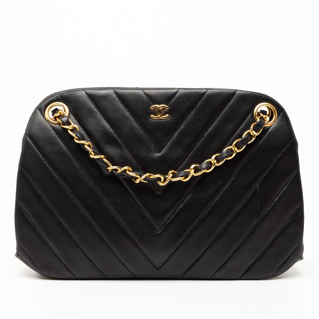 This shoulder bag features a chevron quilted lambskin leather body, a leather-woven chain link strap, an open top with kiss lock closure, and interior zip and slip pockets.