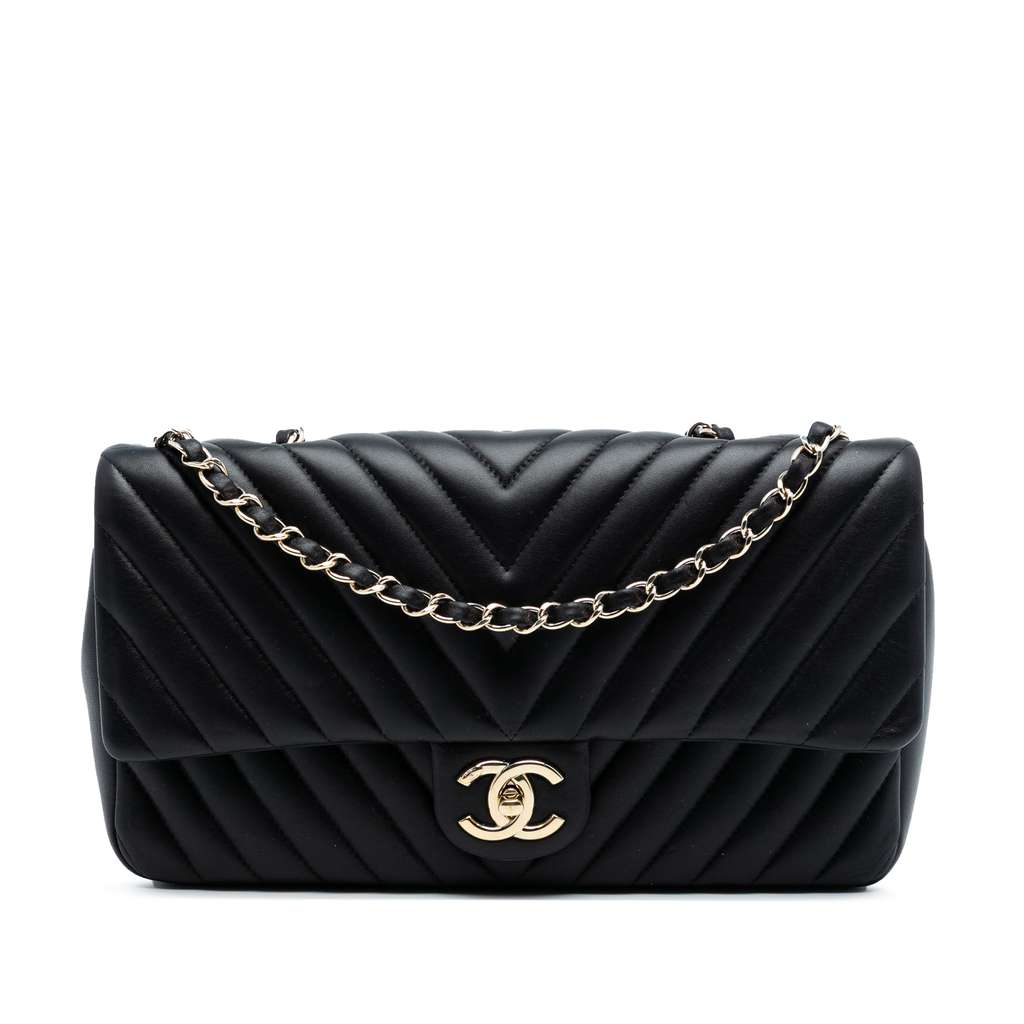 This shoulder bag features a quilted lambskin leather body, leather woven chain link strap, a front flap with CC turn-lock closure, and interior zip and slip pockets.