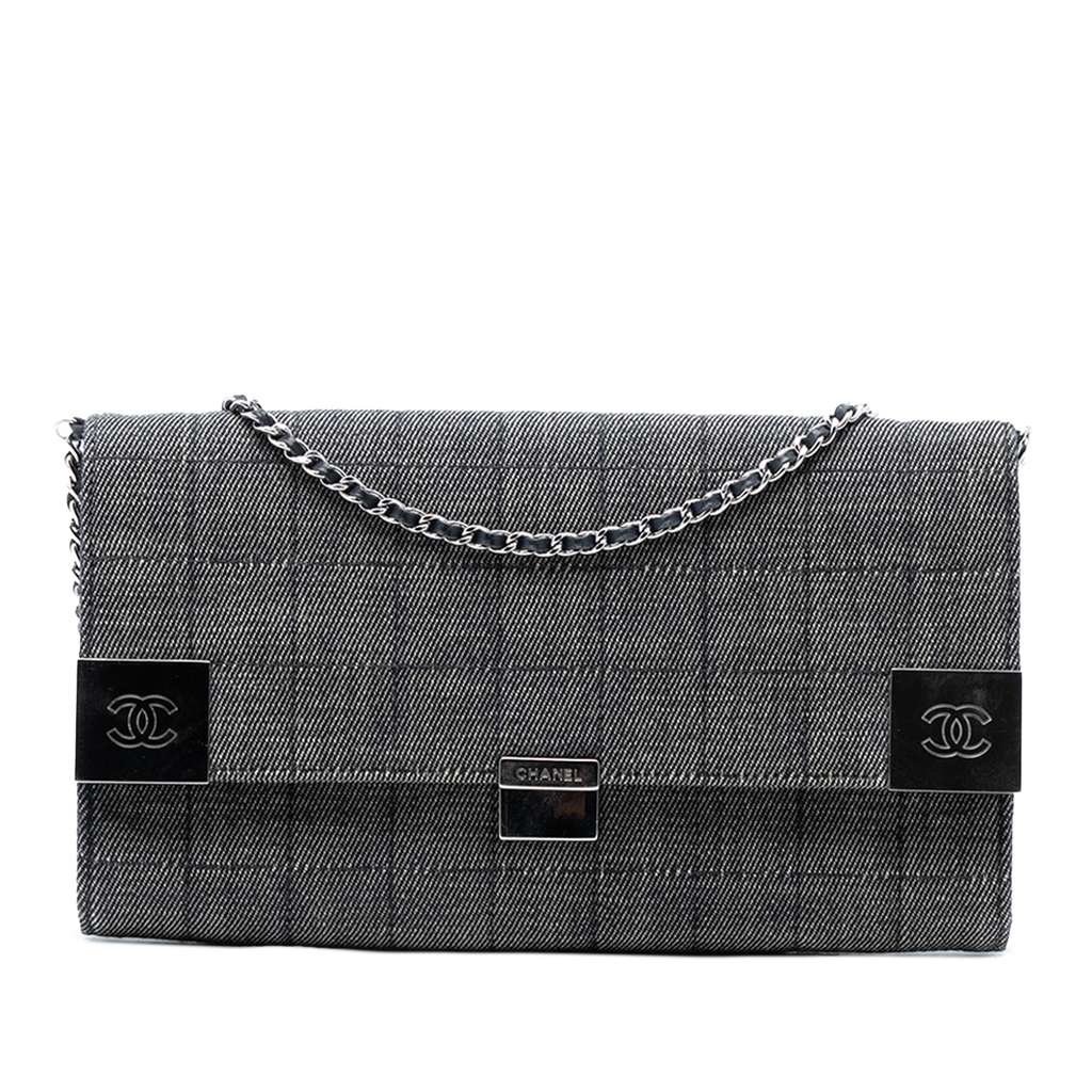 This shoulder bag features a square quilted denim body, a leather woven shoulder chain strap, a front flap with a magnetic snap button closure, and interior slip pockets.